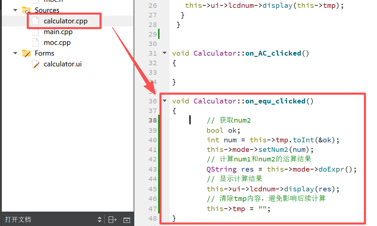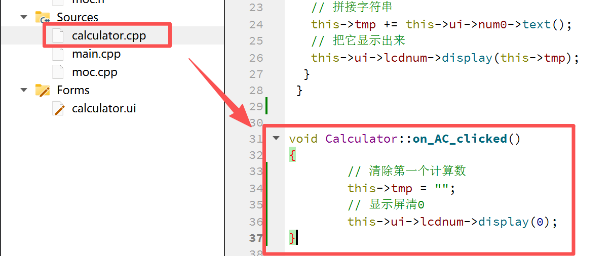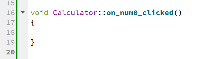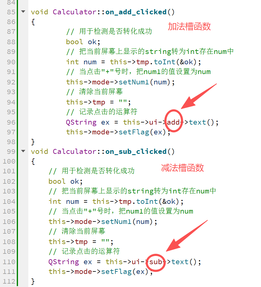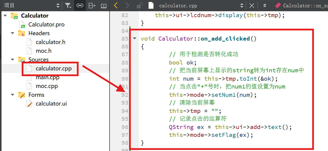 在calculator.cpp源文件中,定义加法槽函数如下图:
