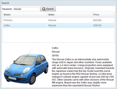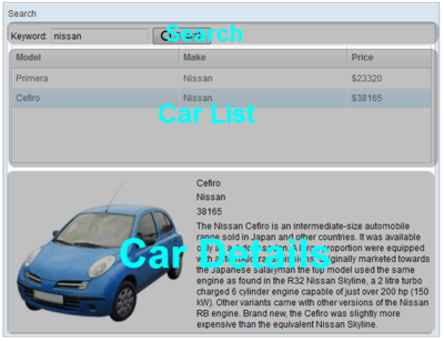 我们的示例应用程序的用户界面窗口内分为3个区域,它们是(从上到下)的搜索功能,汽车名单,以及汽车的详细信息。