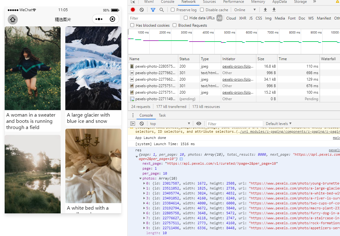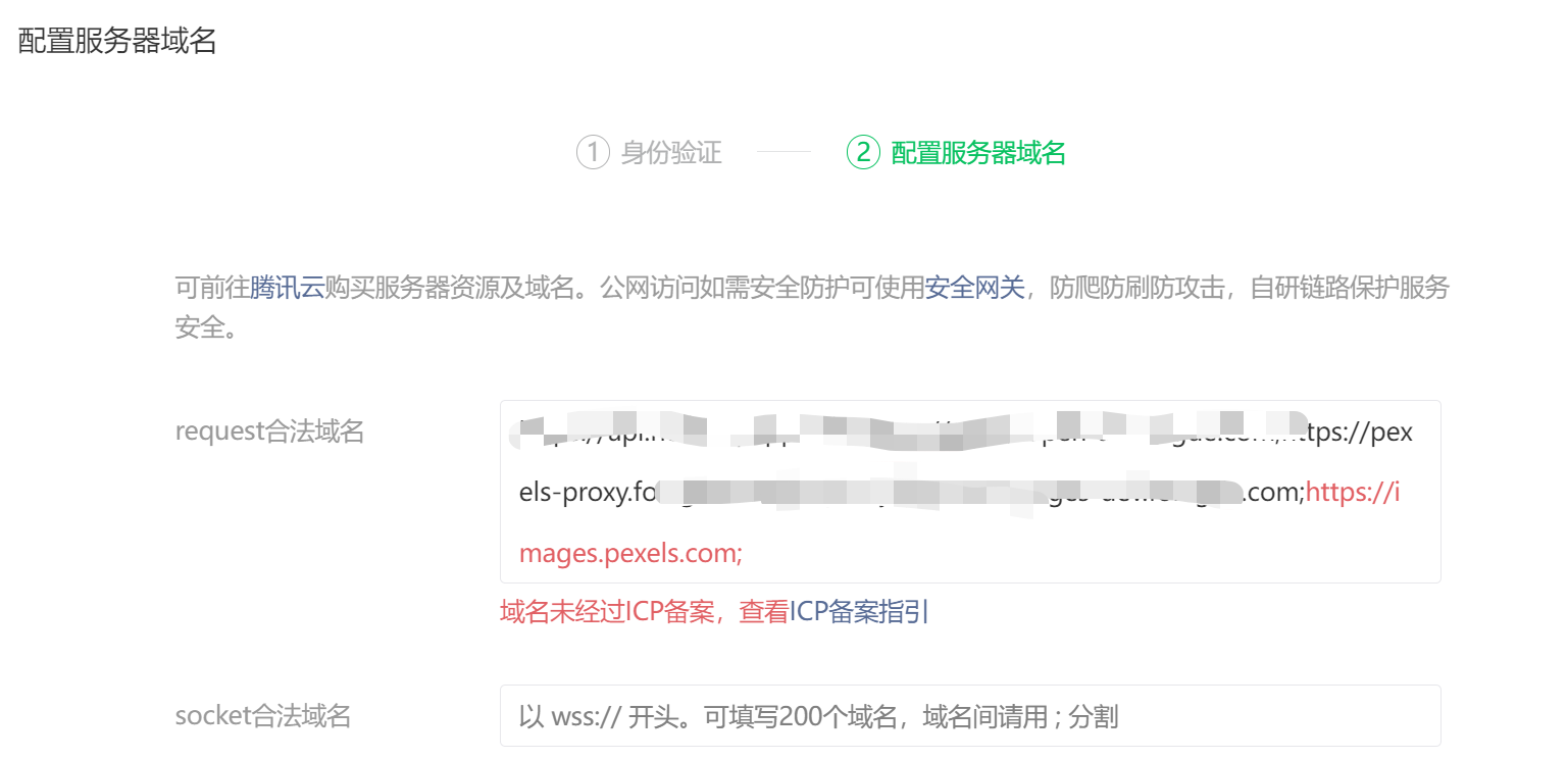 因为pexels.com开放了API可以拿到图片,所以得先请求https://api.pexels.com拿到图片列表,图片的域名是images.pexels.com,两个域名都不能通过小程序后台的校验: