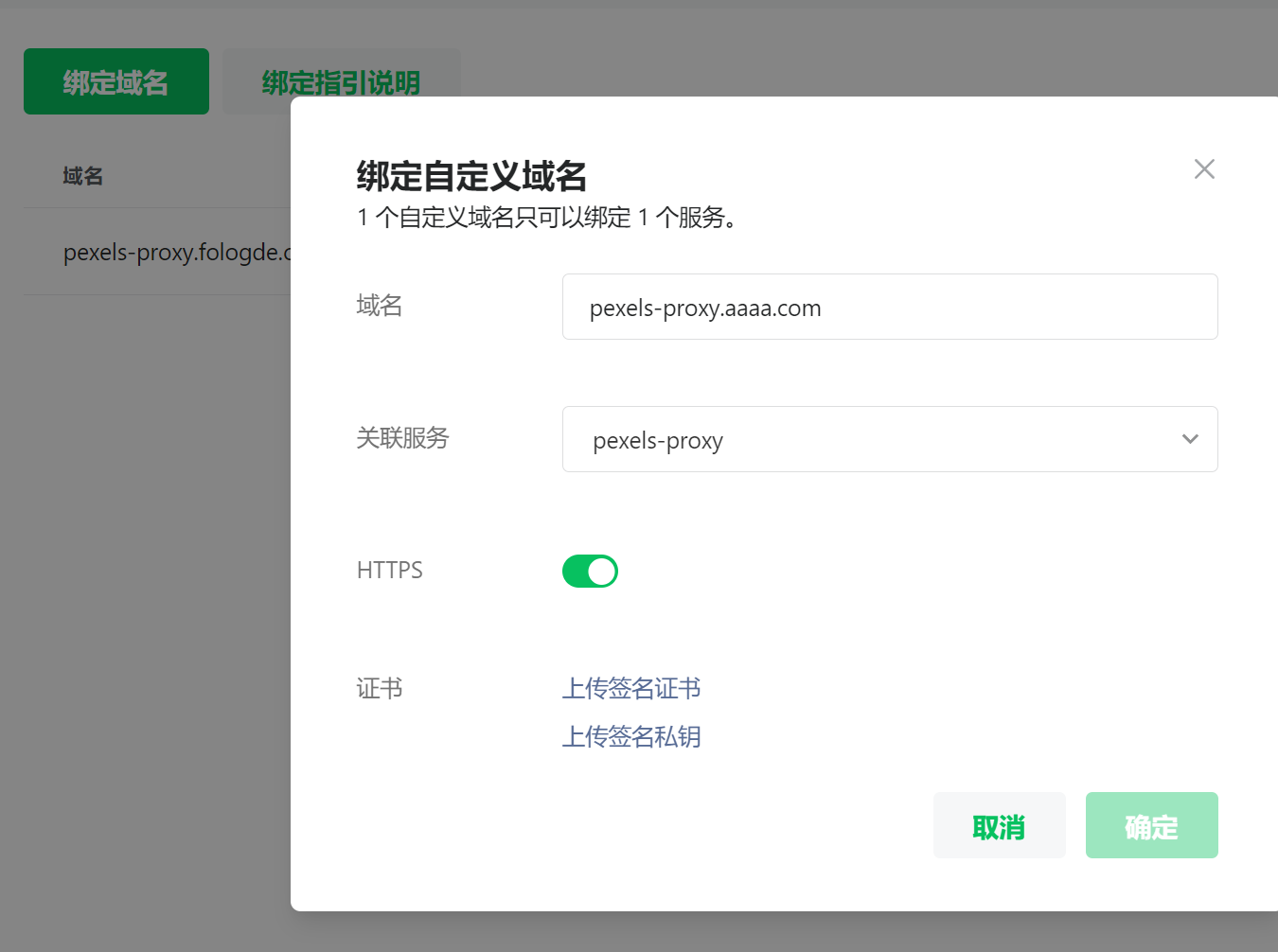 假设aaaa.com是你已经备案好的域名,pexels-proxy是二级域名,如果你的域名有https证书的话,可以先把https证书上传,如果没有我在本文会讲到如果10分钟申请一个免费https证书。