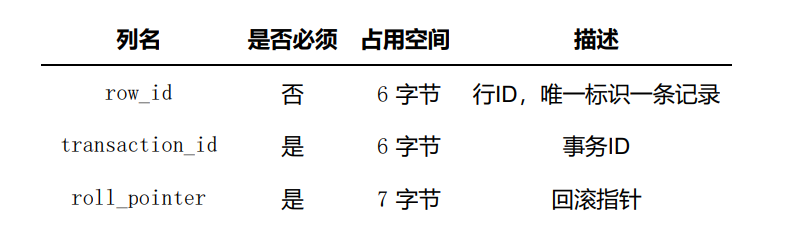 实际上这几个列的真正名称其实是:DB_ROW_ID(row_id)、DB_TRX_ID(transaction_id)、DB_ROLL_PTR(roll_pointer)。