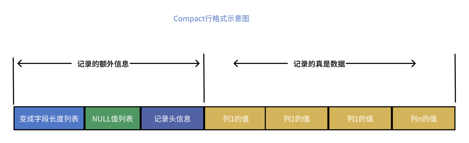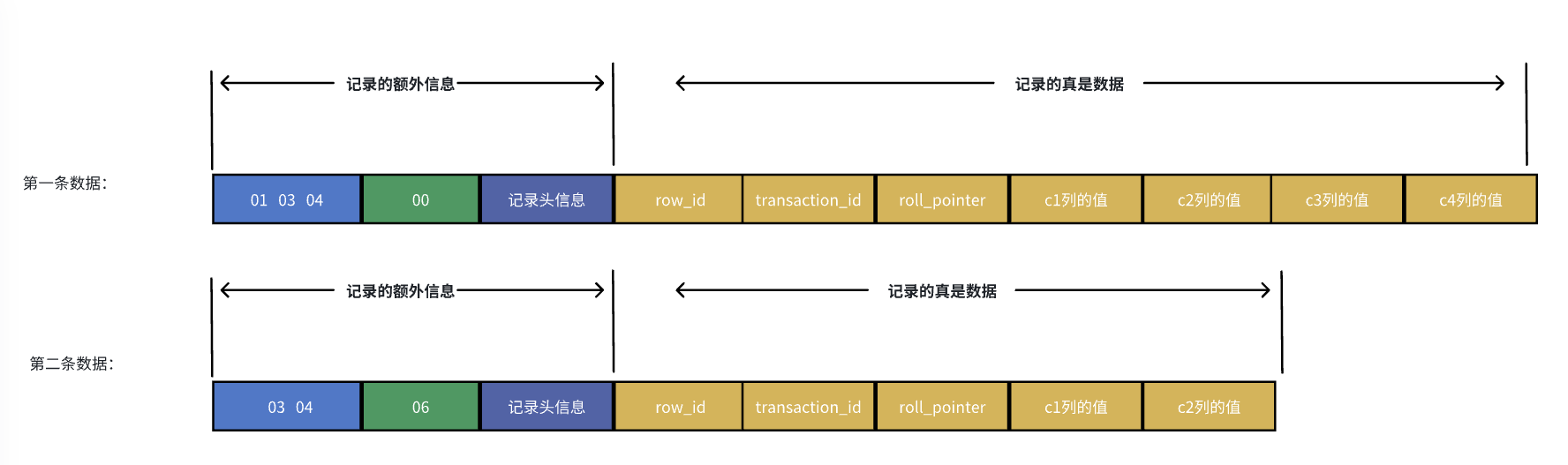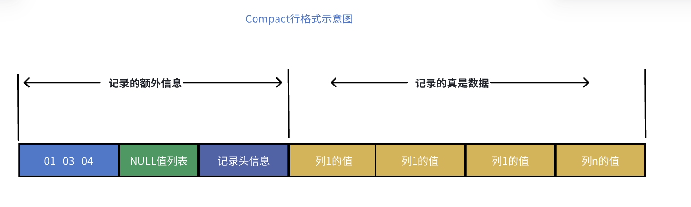从图中可以看出,compact行格式的一条记录可以被分为两部分,记录的额外信息、记录的真实数据。下面是两个部分的详细信息。