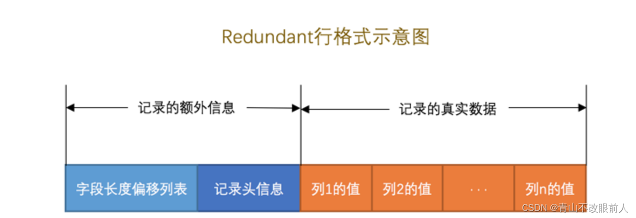 其实知道了 Compact 行格式之后,其他的行格式就是依葫芦画瓢了。我们现在要介绍的 Redundant 行格式是 MySQL5.0 之前用的一种行格式,也就是说它已经非常老了,但是本着知识完整性的角度还是要提一下,大家看看就好。 画个图展示一下 Redundant 行格式的全貌: