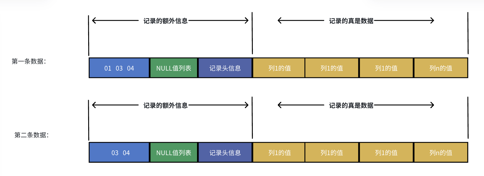 我们知道MySQL支持一些变长的数据类型,例如:VARCHAR(N),TEXT、BLOB类型,我们也可以把拥有这些数据类型的列称为变长字段。变长字段中存储多少字节的数据是不固定的,所以我 们在存储真实数据的时候需要顺便把这些数据占用的字节数也存起来,这样才不至于把 MySQL 服务器搞懵,所以 这些变长字段占用的存储空间分为两部分:真正的数据内容、占用的字节数。