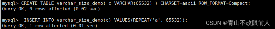 如果 VARCHAR 类型的列有 NOT NULL 属性,那最多只能存储 65533 个字节的数据,因为真实数据的长度可能占用 2个字节,不需要 NULL 值标识: