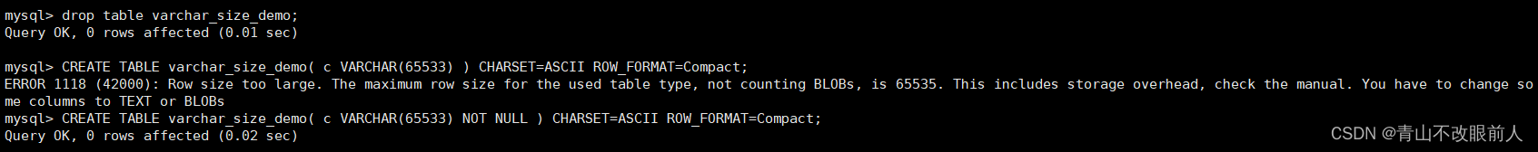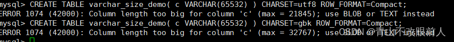 可以看到以下报错: Row size too large. The maximum row size for the used table type, not counting BLOBs, is 65535. This includes storage overhead, check the manual. You have to change some columns to TEXT or BLOBs