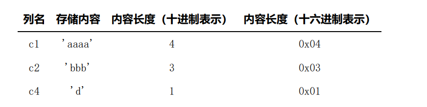 先来看第一条数据,因为c1、c2、c4列均为VARCHAR类型,也就是可变长度类型,所以这三个字段的长度均需要保存到记录开头处,因为 record_format_demo 表中的各个列都使用的是 ascii 字符集,所以每个字符只需要1个字节来进行编码,来看 一下第一条记录各变长字段内容的长度。