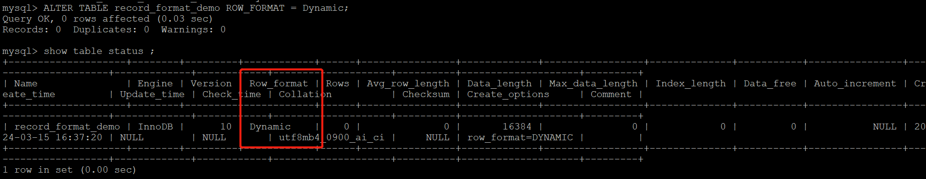 修改行格式: ALTER TABLE record_format_demo ROW_FORMAT = Dynamic;