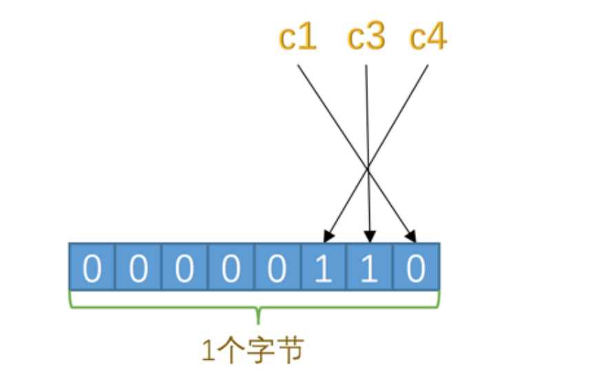 对于第一条记录来说, c1 、 c3 、 c4 这3个列的值都不为 NULL ,所以它们对应的二进制位都是 0 ,画个图就是这样: