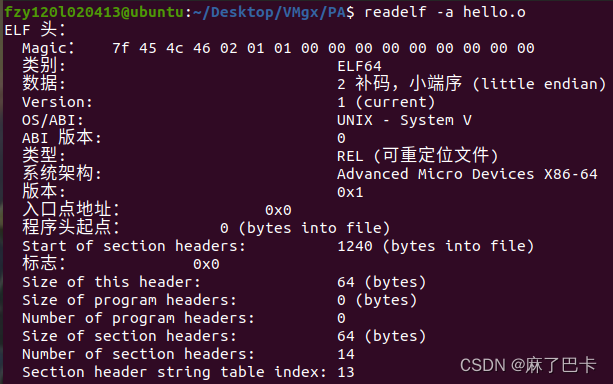 4.hello.s文件经过汇编阶段,生成了hello.o文件,从汇编语言变为了机器语言,并把这些指令打包成了可重定位目标程序。