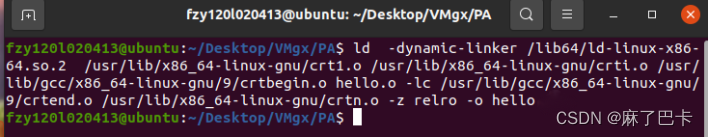 5.hello.o文件经过汇编阶段,生成了hello可执行文件,将各种代码和数据片段收集并组合成为一个单一文件,现在,hello就可以在命令行中运行了。