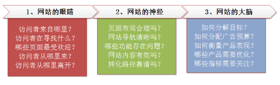 首先,网站分析是网站的眼睛。是从网站的营销角度看到的网站分析。在这部分中,网站分析的主要对象是访问者,访问者在网站中的行为以及不同流量之间的关系。