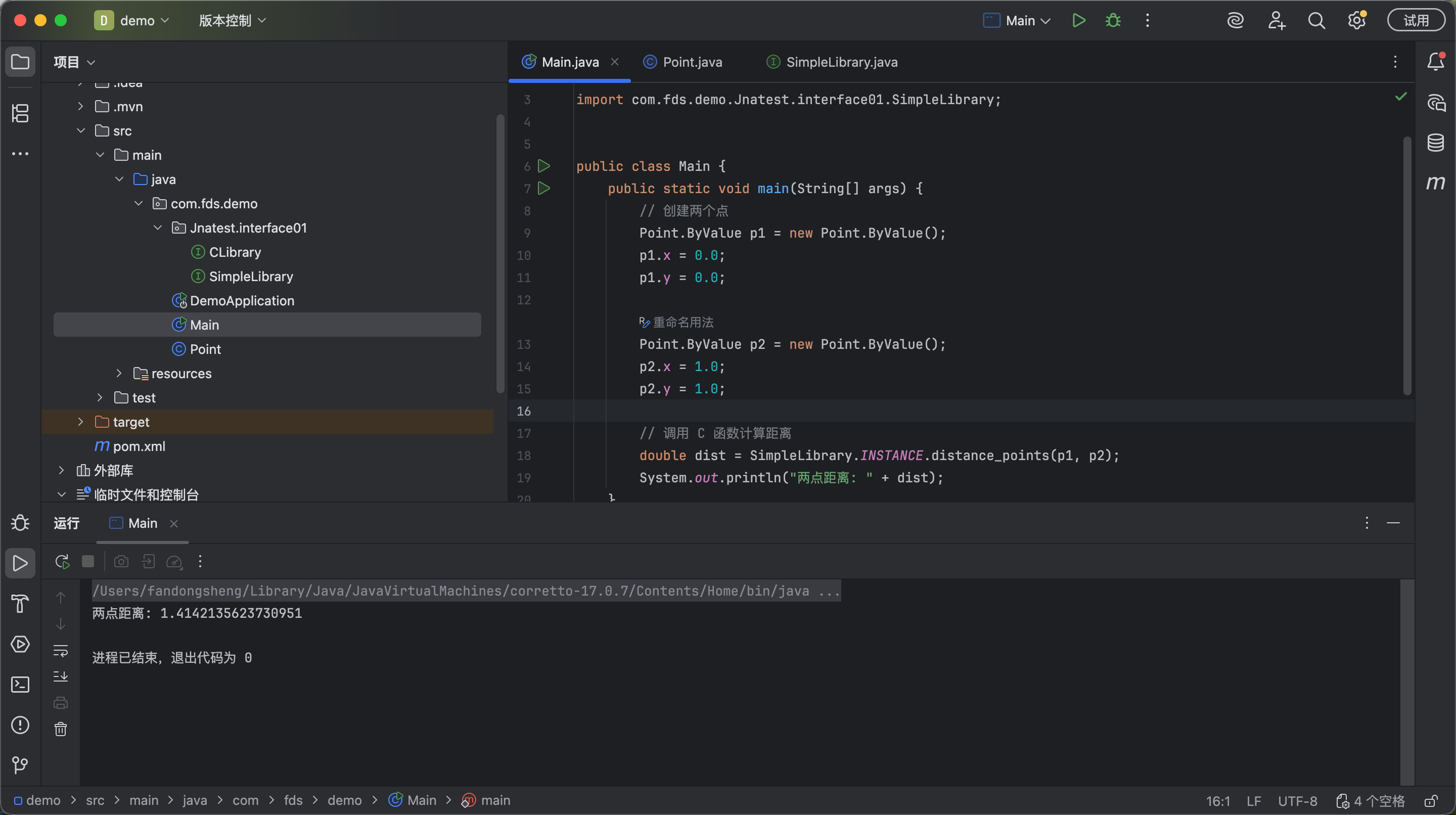 但是我们明白一件事情在C语言中是不存在distance_points()这个方法的。那么我们自己去用c语言写一个这个方法,然后把它弄成C语言的库,然后使用JNA去调用。
