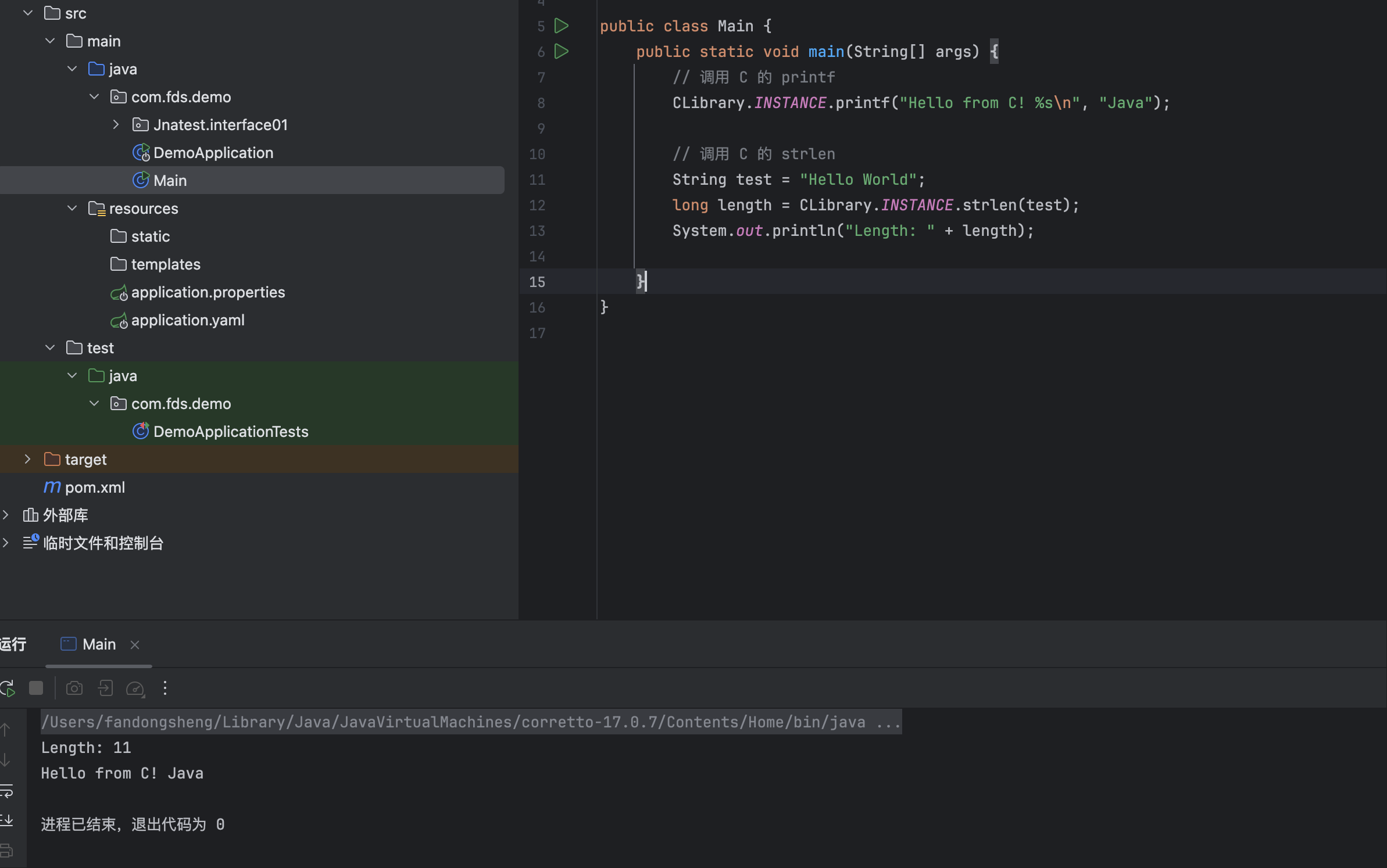 这时发生了一个神奇的现象输出的顺序反了,这个代码为什么执行顺序乱了,应该是先输出Hello from C! Java。后输出Length: 11