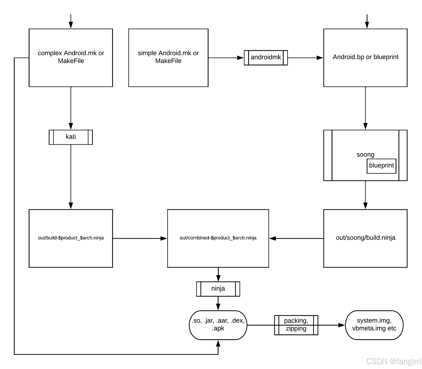 通过这个图,可以看到流程就是输入还是Android.bp,通过soong转换成build.ninja,然后装换成大的ninja文件,通过ninja编译,生成各个产物。最后进行打包。