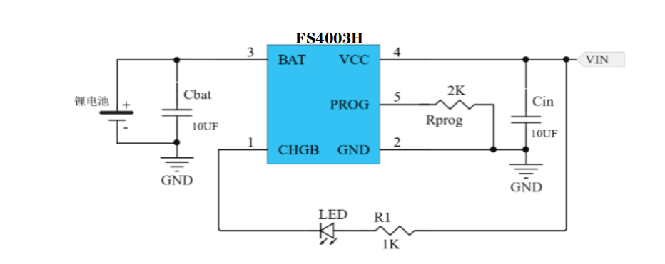 当输入电压(交流适配器或USB电源)被拿掉时,FS4003H自动进入一个低电流状态,将电池漏电流降至2μA以下。也可将SC4054H置于停机模式,从而将供电电流降至55μA。FS4003H的其它特点包括充电电流监控器、欠压闭锁、自动再充电和一个用于指示充电结束和输入电压接入的状态引脚。