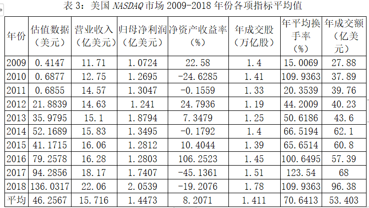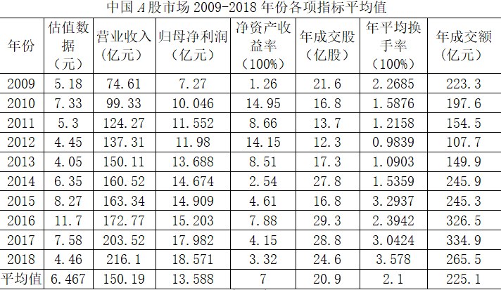 运用平均值法统计出2009-2018年中的平均估值水平、平均营业收入、平均年度归母净利润、年度净资产收益率、年度单只股票交易量、年度单只股票交易金额、年度单只股票平均换手率,见下表。