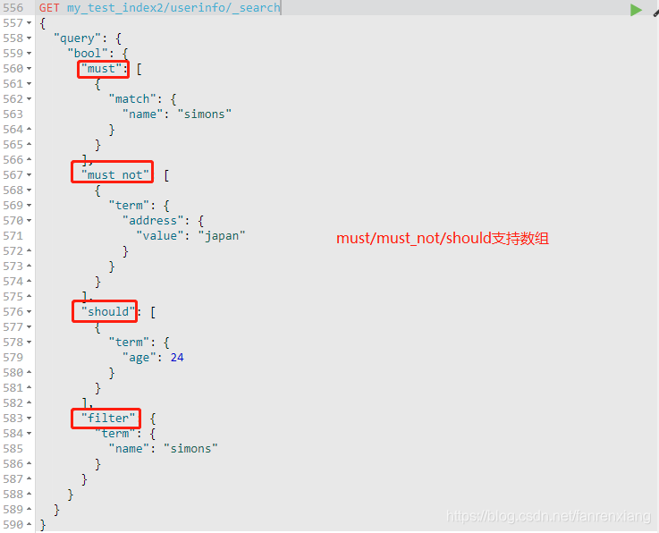1、must、must_not、should支持数组,同时filter的查询语句,es会对其进行智能缓存,因此执行效率较高,在不需要算分的查询语句中,可以考虑使用filter替代普通的query语句;