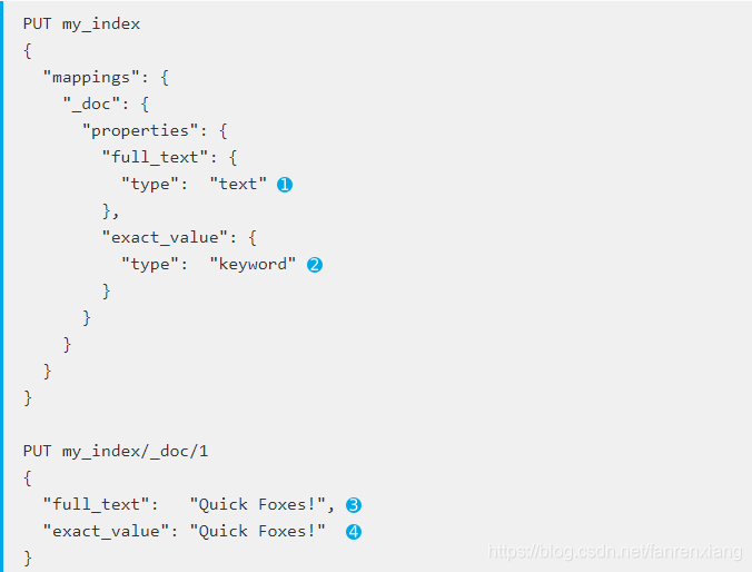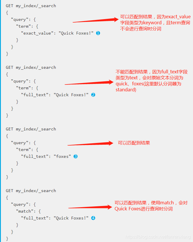 term查询语句不会对查询语句进行分词处理,直接拿查询输入的文本去检索,如下是官方文档测试案例,非常清晰: