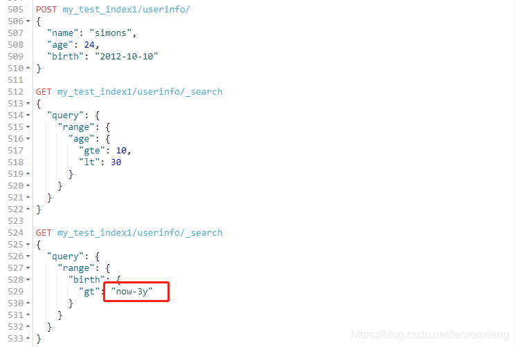 在range范围查询中,es提供了一种更加简便的日期计算,now表示当前时间,时间单位y:年,M:月,d:天,H:时,m:分,s:秒,所以now-3y就表示当前时间减去3年后的时间。