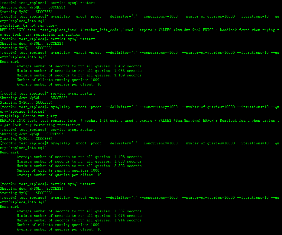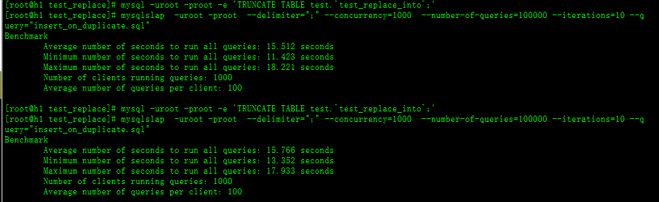mysqlslap -uroot -proot --delimiter=";" --concurrency=1000 --number-of-queries=10000 --iterations=10--query="replace_into.sql"