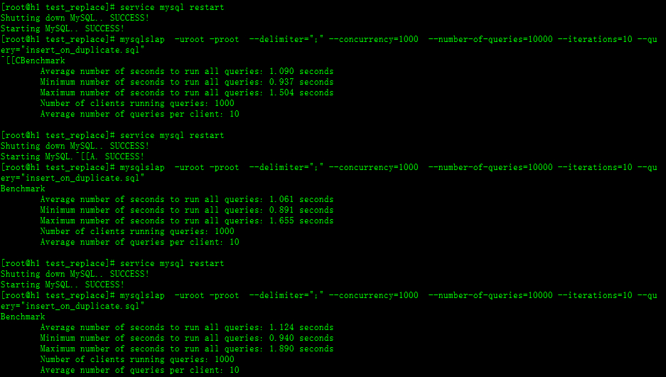 mysqlslap -uroot -proot --delimiter=";" --concurrency=1000 --number-of-queries=10000 --iterations=10--query="insert_on_duplicate.sql"
