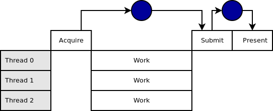 This is much better. Here we start recording work for the next frame immediately after submitting the current frame to the device queue. All synchronization here is done using semaphores. vkAcquireNextImageKHR will signal a semaphore once the swap chain image is ready, vkQueueSubmit will wait for this semaphore before processing any of the commands and will signal another semaphore once the submitted commands are completed. Finally, vkQueuePresentKHR will present the image to the display, but it will wait for the signaled semaphore from vkQueueSubmit before doing so.