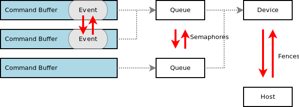 - Events and barriers - used to synchronize work within a command buffer or a sequence of command buffers submitted to a single queue