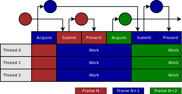 In the above sequence there is no overlap of work between different frames. Therefore, even though we're recording work to command buffers in multiple threads, we still have a certain amount of time where the CPU threads sit idle waiting for a signal in order to start work on the next frame.