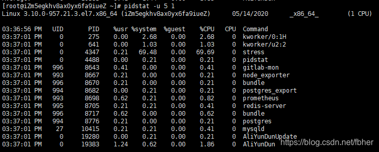 3.再说一个命令pidstat n m(n:采样周期,m:采样次数),这个命令可以看出单个进程的负载率