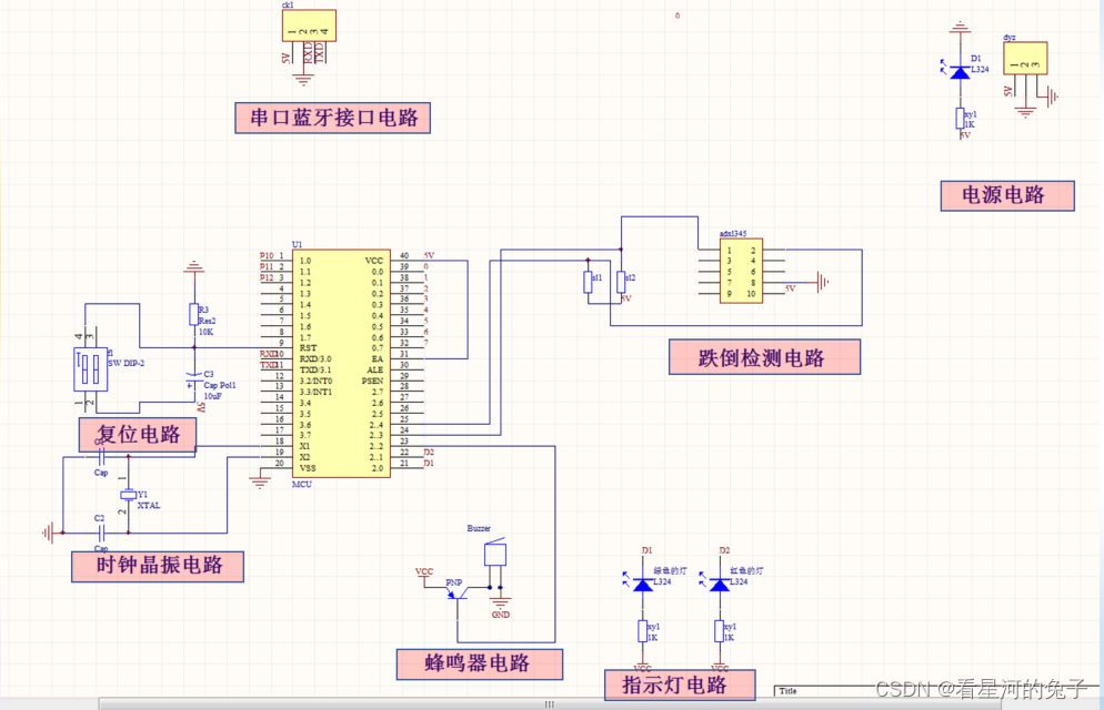 基于STC89C52的老人蓝牙跌倒报警器从电路到软件分析 电路板处于直立状态时(人处于直立状态时),绿色指示灯亮起,系统无报警,手机APP端界面显示“状态正常”。电路板倾倒时(人处于跌倒状态时),红色指示灯亮起,蜂鸣器报警,手机端界面出现红色字样提示“已经摔跤,需要救助”。若为误报警,可按下取消报警按钮,系统初始化,取消报警。