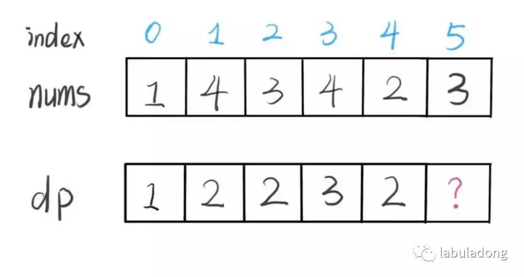 nums[5] = 3,既然是递增子序列,我们只要找到前面那些结尾比 3 小的子序列,然后把 3 接到最后,就可以形成一个新的递增子序列,而且这个新的子序列长度加一。