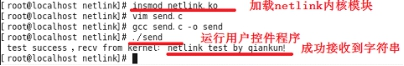 下面是对netlink的一个简单测试,将字符串“netlink test by qiankun”通过netlink输出到内核,内核再把字符串返回。Netlink类型使用的是22.
