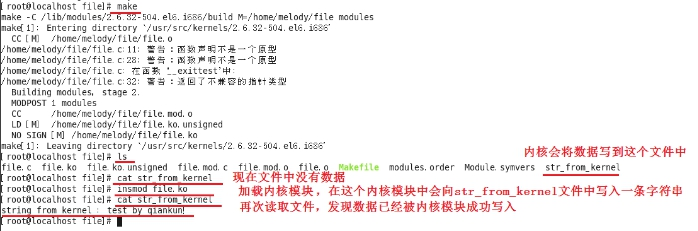 5.文件:应该说这是一种比较笨拙的做法,不过确实可以这样用。当处于内核空间的时候,直接操作文件,将想要传递的信息写入文件,然后用户空间可以读取这个文件便可以得到想要的数据了。下面是一个简单的测试程序,在内核态中,程序会向“/home/melody/str_from_kernel”文件中写入一条字符串,然后我们在用户态读取这个文件,就可以得到内核态传输过来的数据了。