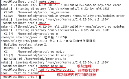 下面是一个简单的测试用例,通过读虚拟出的文件可以得到内核空间传递过来的“proc ! test by qiankun!”字符串。
