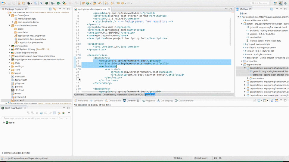 这里事先创建好了一个 Spring Boot 项目,然后将项目导入了开发工具 STS 中。查看项目的 pom.xml 文件,parent 节点配置了 Spring Boot 的信息,指定了版本为 2.1.6.RELEASE,并且依赖了 spring-boot-starter-web。