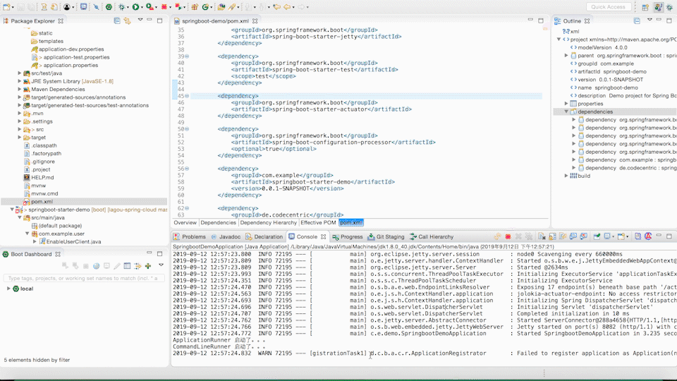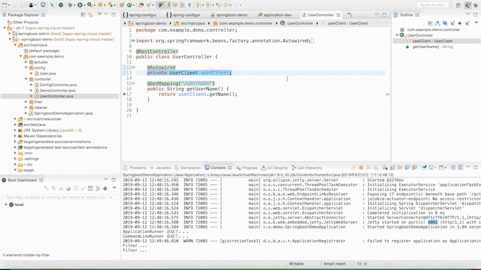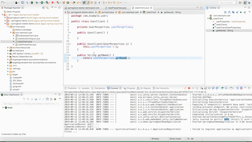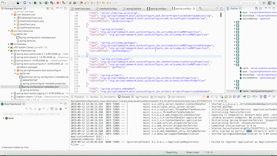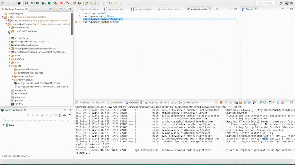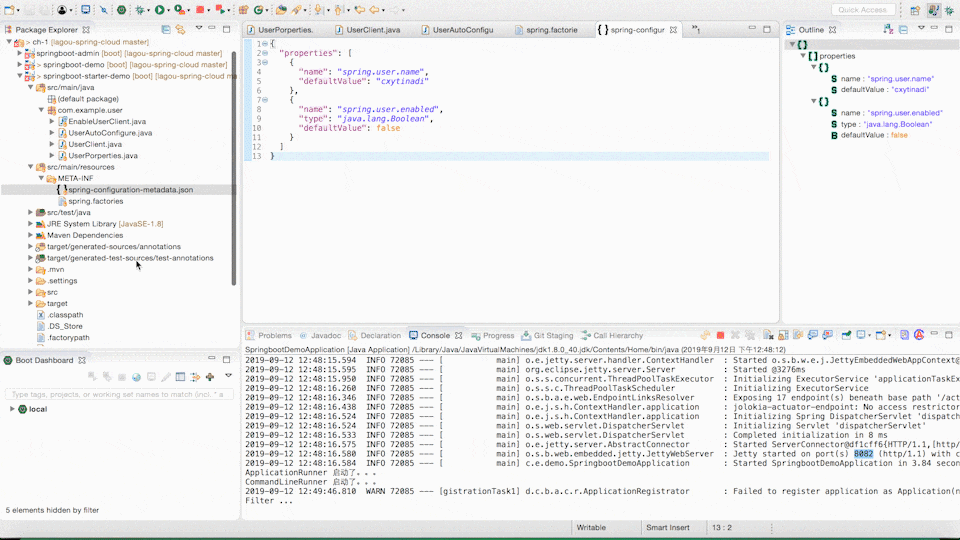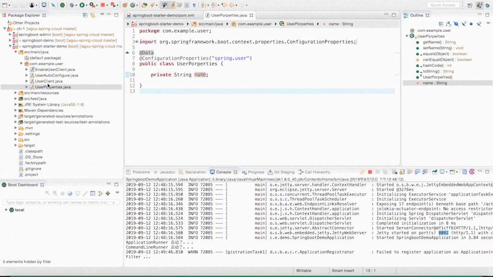 最后一步,我们需要在使用的项目中加入我们自定义的 Starter 的依赖,然后在配置文件中增加配置 spring.user.name,这样就完成了整个流程。