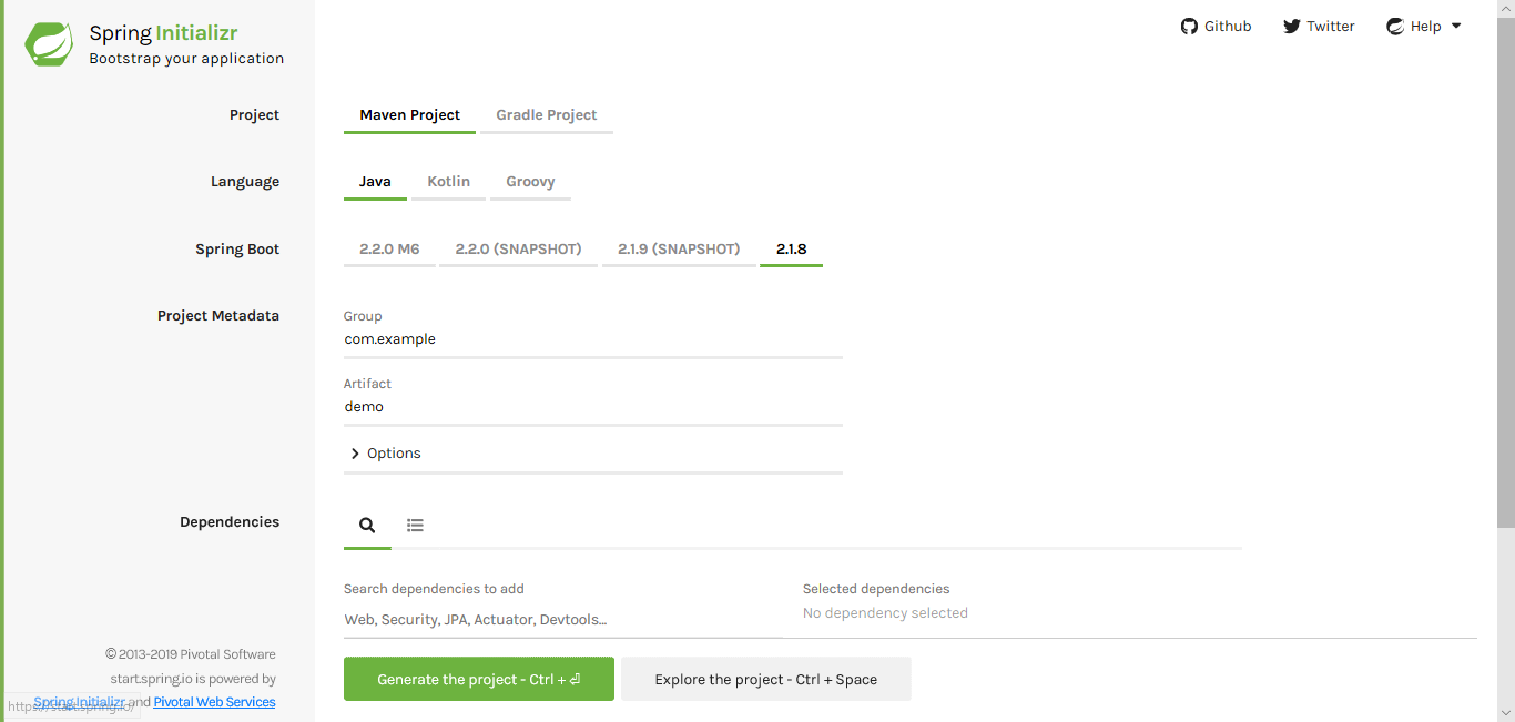 进入页面后,你可以选择即将创建项目的类型是 Maven 或是 Gradle, 以及开发语言,Spring Boot 版本,依赖的 Starter 等信息,最后生成项目,下载到本地,然后导入开发工具中。