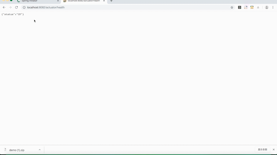 然后我们启动下项目, 访问 actuator/health 这个端点,可以看到返回了 status为UP,证明当前健康状态是正常的,如果 status 为 DOWN 那就是不健康的状态。