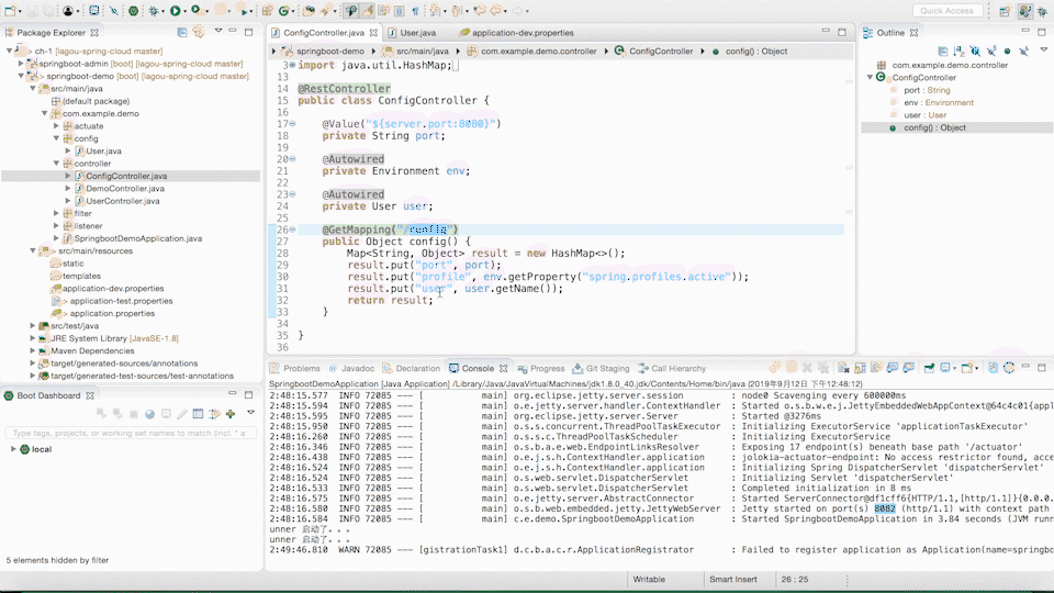 那么该使用哪个环境下的配置取决于 spring.profiles.active 的值,在默认的 application.properties 中配置 spring.profiles.active=dev,启动项目,可以看到当前的端口是 8082,再次将 spring.profiles.active=dev 改成 test,启动项目,端口变成 8083,这样我们就可以做到在不同环境下使用不同的配置了。
