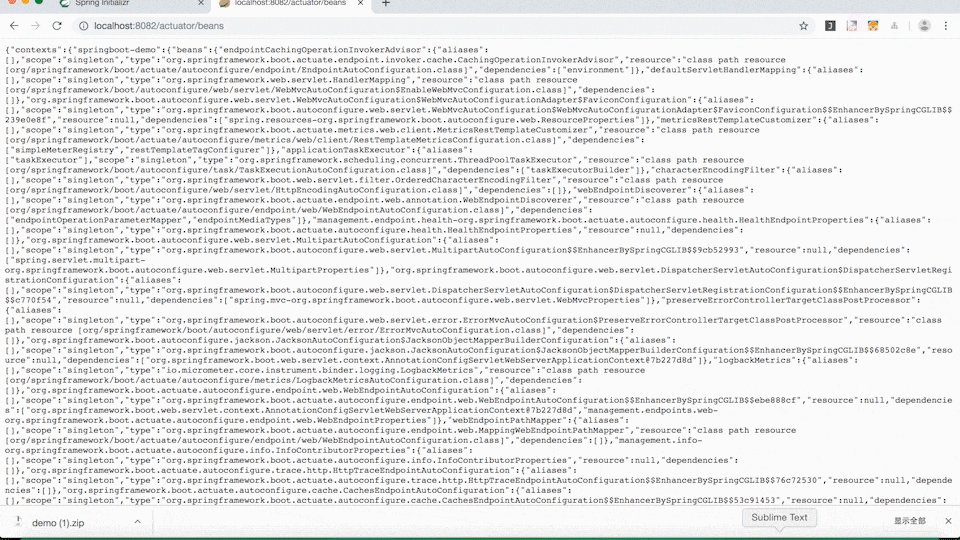 /actuator/beans 查看 bean 及其关系列表,其他的端点也是一样的访问方式,不做过多讲解。更多端点的信息请参考官方文档。