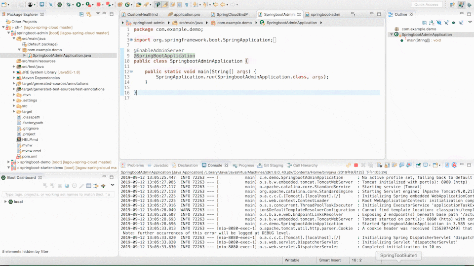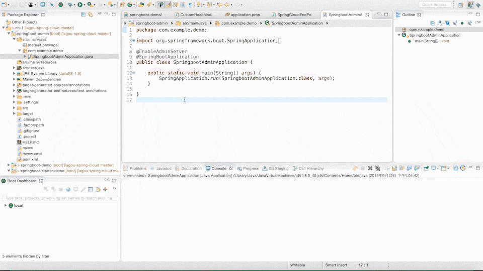 接下来体验一下 Spring Boot Admin,首先我们需要创建一个 Spring Boot 项目,我这里创建了一个 Spring Boot Admin 的项目,然后在 pom 中加入 spring-boot-admin-starter-server