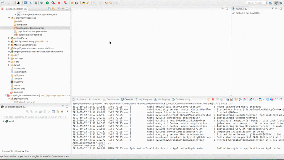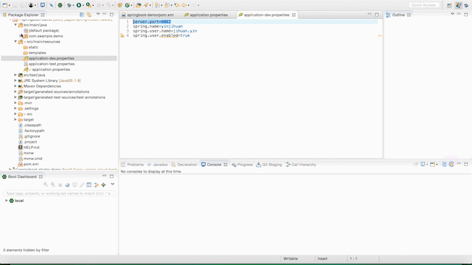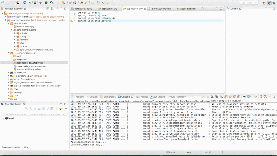 首先在 resources 目录下创建一个 application-dev.properties,配置 server.port=8082。
