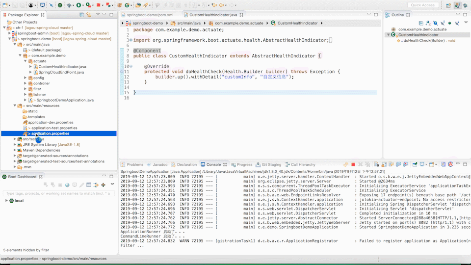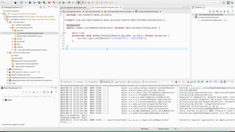 如果我们需要加入一些其他的判断来决定应用的监控状态时,可以继承 AbstractHealthIndicator 类,实现自己的 HealthIndicator。具体需要实现 doHealthCheck 方法,在 doHealthCheck 中进行健康状态的判断,健康状态使用 builder.up() 表示,不健康使用 builder.down() 方法表示,未知的状态使用 builder.unknown() 方法表示,应用已停止服务使用 builder.outOfService() 方法表示。