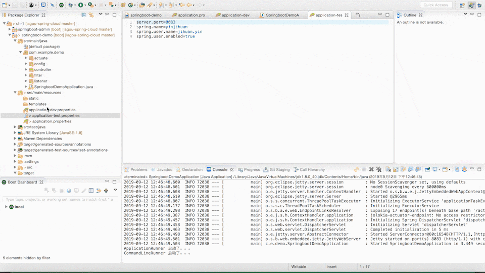 然后再创建一个 application-test.properties,配置 server.port=8083,现在相当于有 dev 和 test 两个环境的配置。