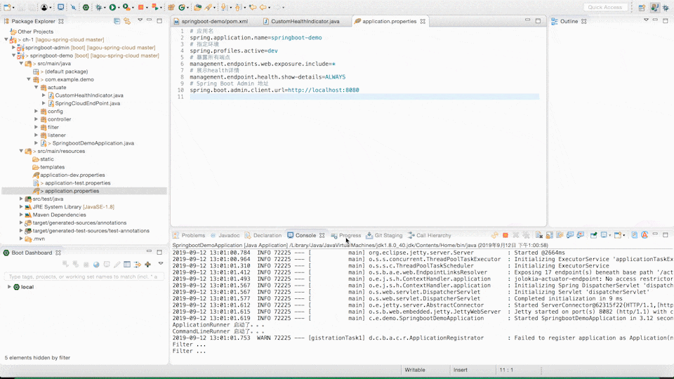 刚刚介绍的时候有讲过,Spring Boot 项目需要集成 Spring Boot Admin Client 向 Spring Boot Admin Server 进行注册,那我们就在项目中增加 spring-boot-admin-starter-client 的依赖,光增加依赖可不行,需要用户必须得知道注册到哪里去了,所以我们需要在配置文件中指定 Spring Boot Admin Server 的地址才行,配置为 spring.boot.admin.client.url=http://localhost:8080