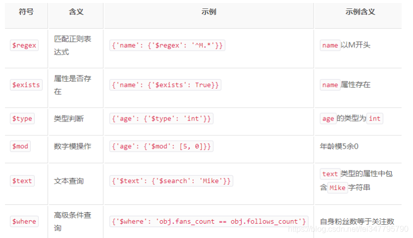 res = p.find({'name':{'$regex':'^A.*'}}) # 查询集合中name以A开头的数据