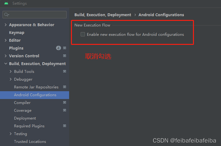 在File->Settings->Build, Execution, Deployment,找到Android Configurations,不勾选“Enable new executon flow for Android configurations”