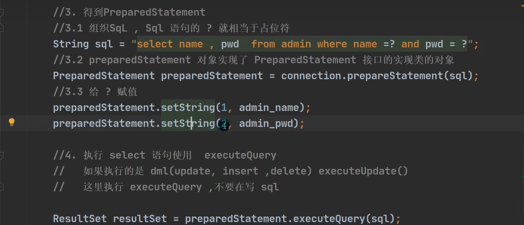 使用 ? 做参数的占位符,从而解决由于字符串拼接带来的SQL注入危险