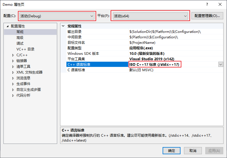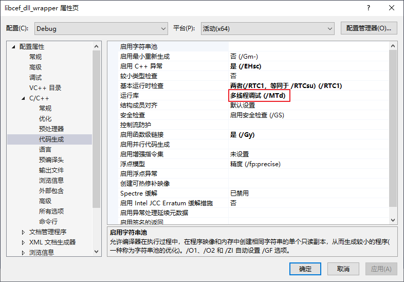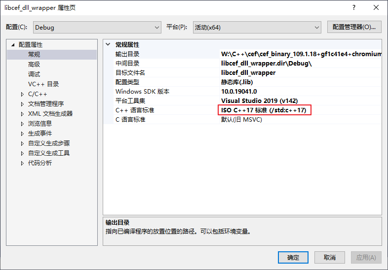 libcef_dll_wrapper项目的C++语言标准默认为C++17,且使用静态编译,后面自己建工程时需与此一致: